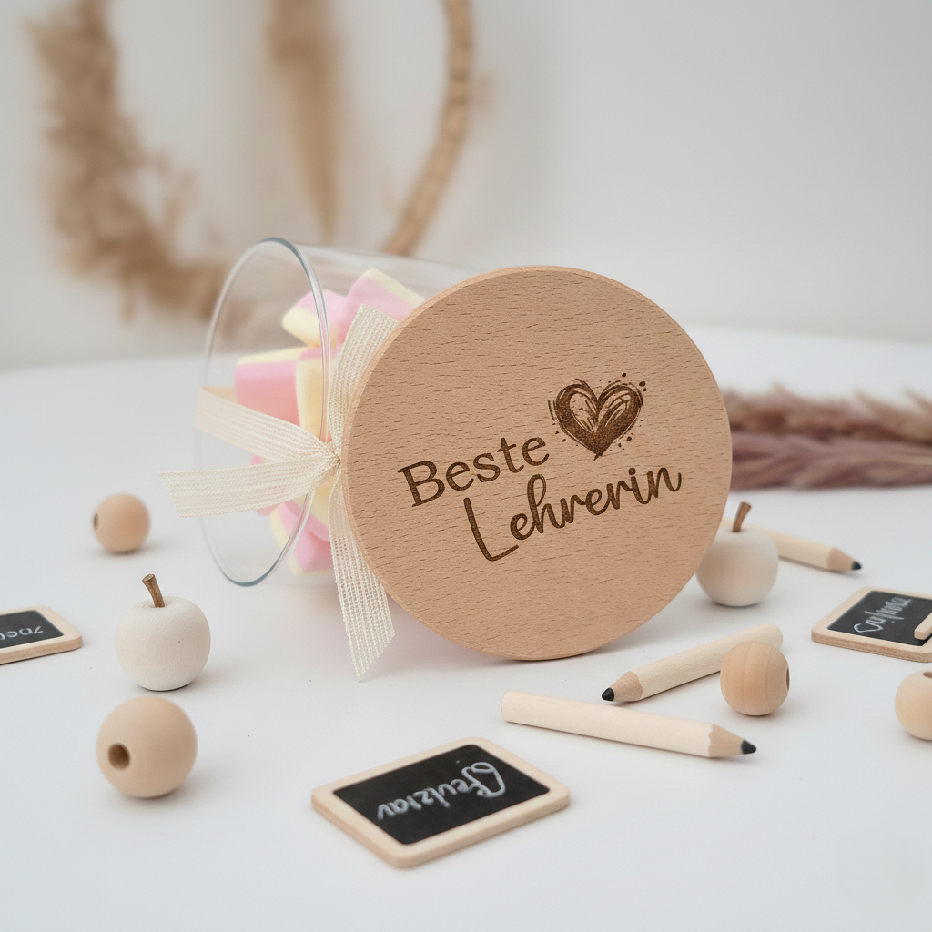 Wunderschönes Abschiedsgeschenk für die beste Lehrerin zum Schulabschluss, Schulwechsel oder einfach so als kleines Dankeschön für ihre Arbeit. Eine tolle Aufmerksamkeit und ein Dankeschön. Unser Vorratsglas mit Buche Holzdeckel wird von uns graviert.
