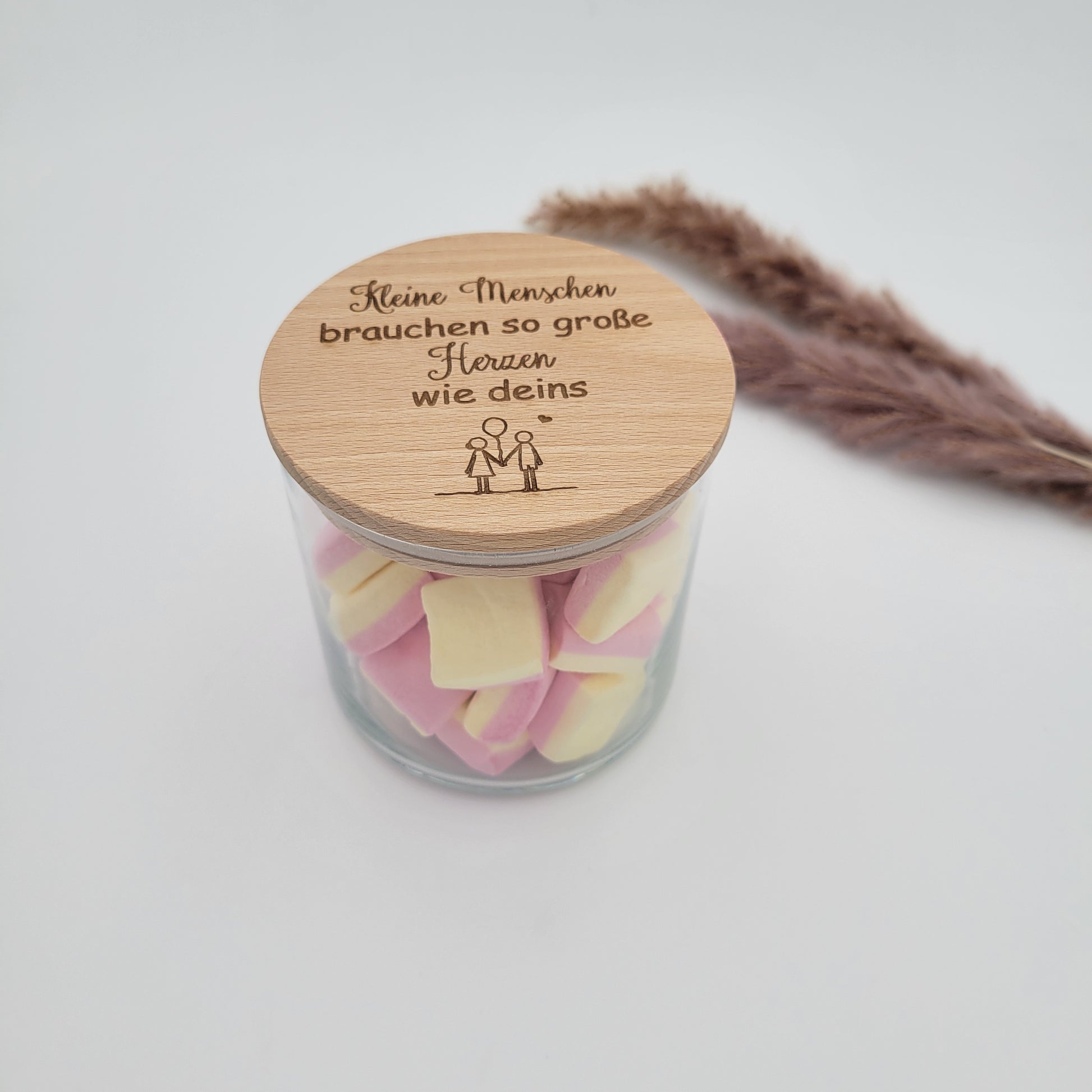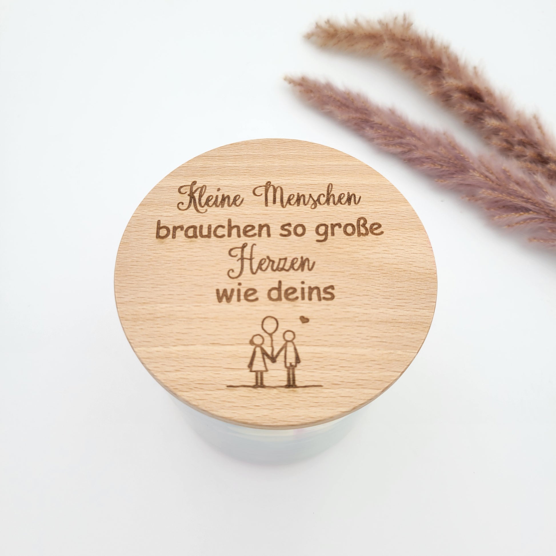 Kleine Menschen brauchen so große Herzen wie deins. Tolles Glas mit Buche Holzdeckel graviert mit kleinem Motiv. Unser Vorratsglas ist eine wunderschöne Geschenkidee für Erzieher, die Kita Leitung, Lehrer, Trainer, Abschiedsgeschenk Kindergarten als kleines Dankeschön für ihre Arbeit. Gefüllt mit Leckereien oder einem kleinen Gutschein ein schönes Geschenk und eine kleine Aufmerksamkeit und Wertschätzung. Vielleicht bindest Du noch ein kleines Schleifchen um das Glas, dann ist das Geschenk perfekt.