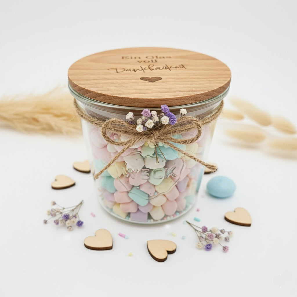 Die Gravur "Ein Glas voll Dankbarkeit" und das Herzmotiv machen es zu einem tollen Geschenk für deine Freunde, Familie, Nachbarn, Kollegen, Erzieher, Lehrer..