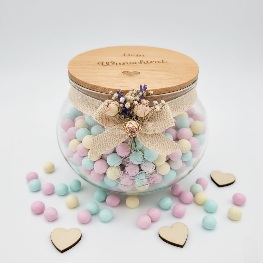 Du suchst ein wirklich einzigartiges Geschenk? Dann ist dieses wunderschöne Glas mit dem gravierten Holzdeckel genau richtig! Durch die runde, geschwungene Form ist es ein echter Hingucker, egal ob befüllt oder leer.
