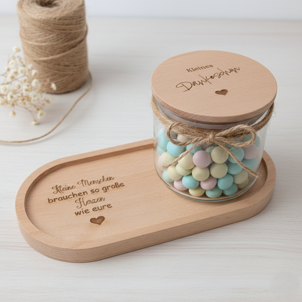Suchst Du nach einem wirklich tollen Geschenk für die Erzieherin, Lehrerin, Hortnerin oder Tagesmutter? Unser wunderschönes Set, bestehend aus einem ovalen Holztablett und einem Vorratsglas mit graviertem Holzdeckel ist mehr als nur ein Deko-Element – es ist ein Stück, welches jeden Tag Freude bringt.