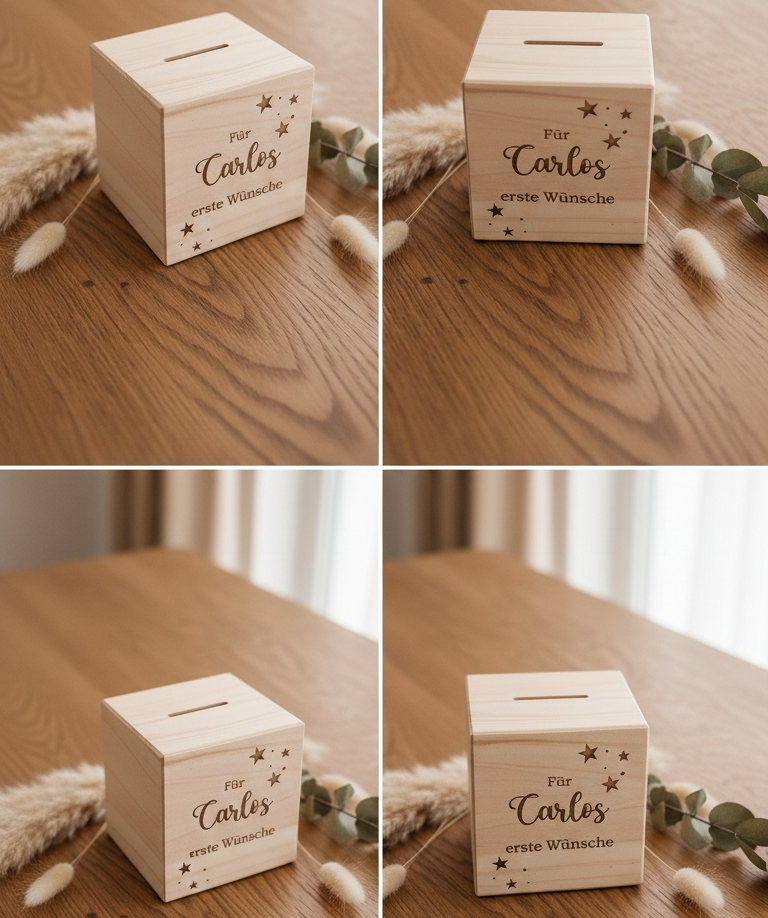 Unsere wunderschöne Spardose aus Holz hat Platz für große Träume und die allerersten kleinen Schätze.