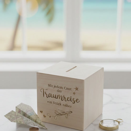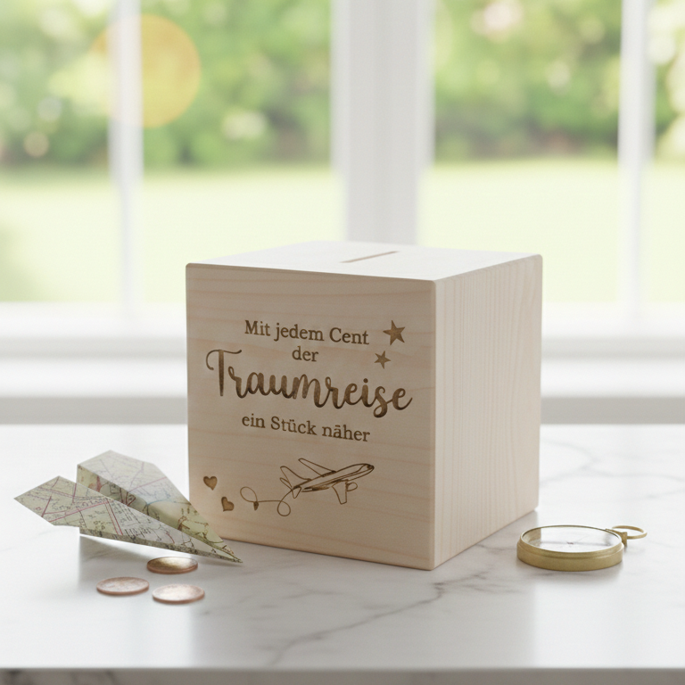 Unsere handliche Spardose aus echtem Kiefernholz ist dein treuer Begleiter auf dem Weg zu deiner nächsten Traumreise. Mit der wunderschönen Gravur „Mit jedem Cent der Traumreise ein Stück näher“ hast du dein Ziel immer direkt vor Augen.