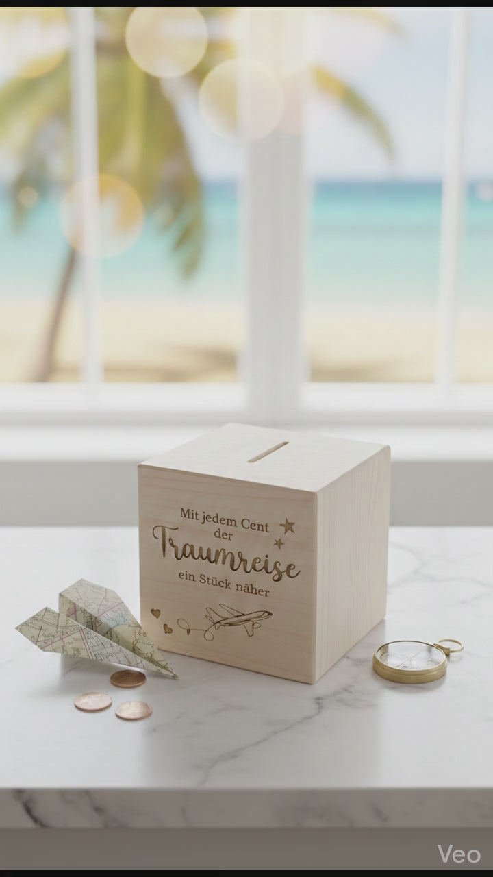 Spardose Traumreise aus Holz mit Gravur