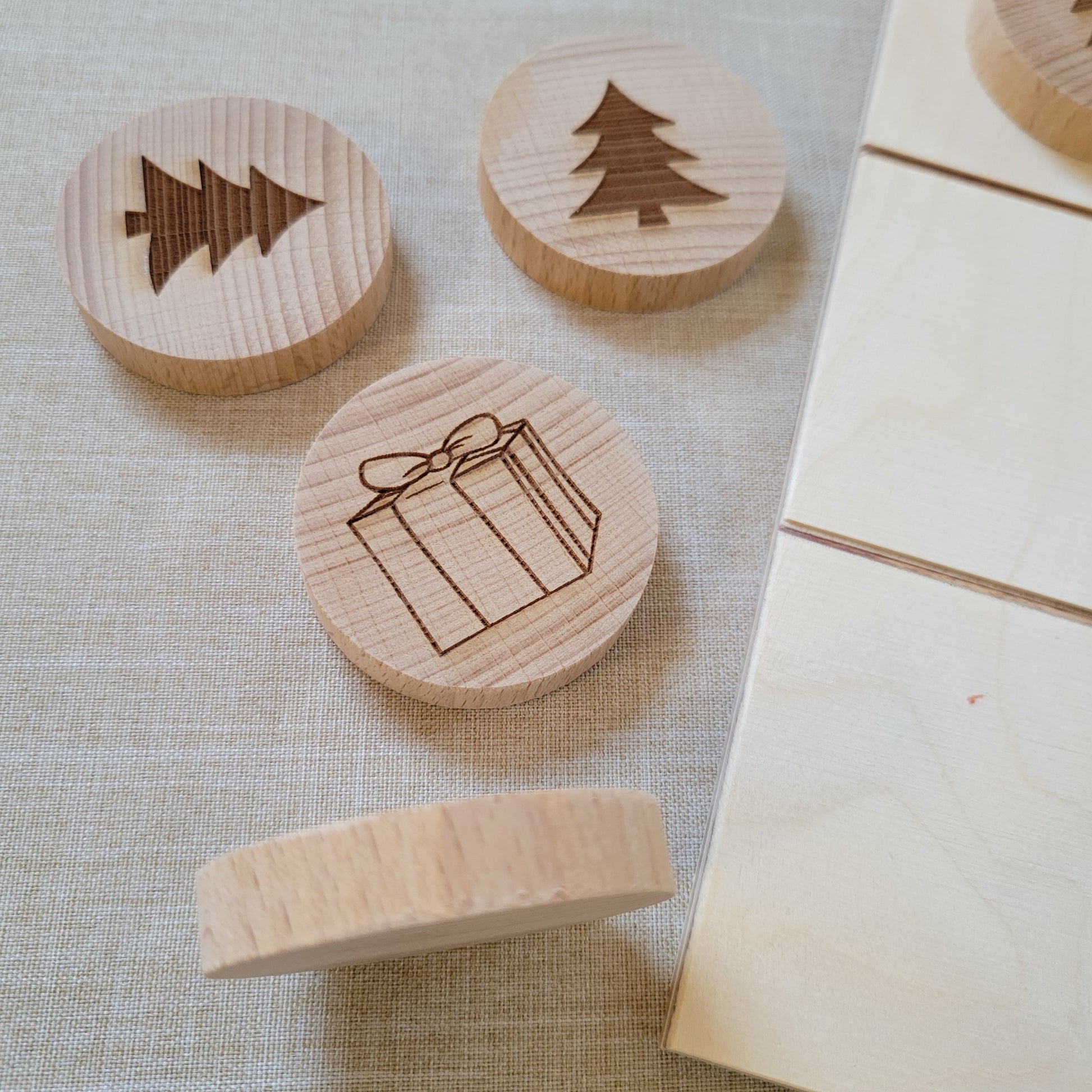 Unser Spiel besteht aus einer Holz Grundplatte ca 21,5 x 21,5 cm groß und 10 Spielsteinen 5x Baum / 5x Geschenk ca 5 x 1 cm groß.