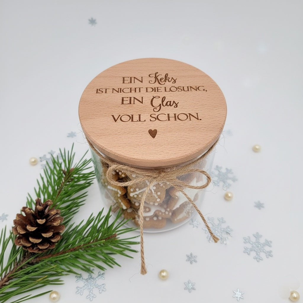 "Ein Keks ist nicht die Lösung, ein Glas voll schon" wird in den Holzdeckel graviert. Das klare, dicke Glas lässt den leckeren Inhalt auf den ersten Blick erkennen und schützt deine Leckereien zuverlässig. Der Deckel ist mit einem Dichtungsring ausgestattet, der dafür sorgt, dass deine Kekse, Plätzchen oder Süßigkeiten lange frisch und knusprig bleiben. Mit ein paar selbstgebackenen Cookies und einer kleinen Schleife dekoriert, wird dieses Glas zum perfekten Geschenk für Geburtstage, Einweihungspartys oder einfach als kleine Aufmerksamkeit für deine Lieblingsmenschen.