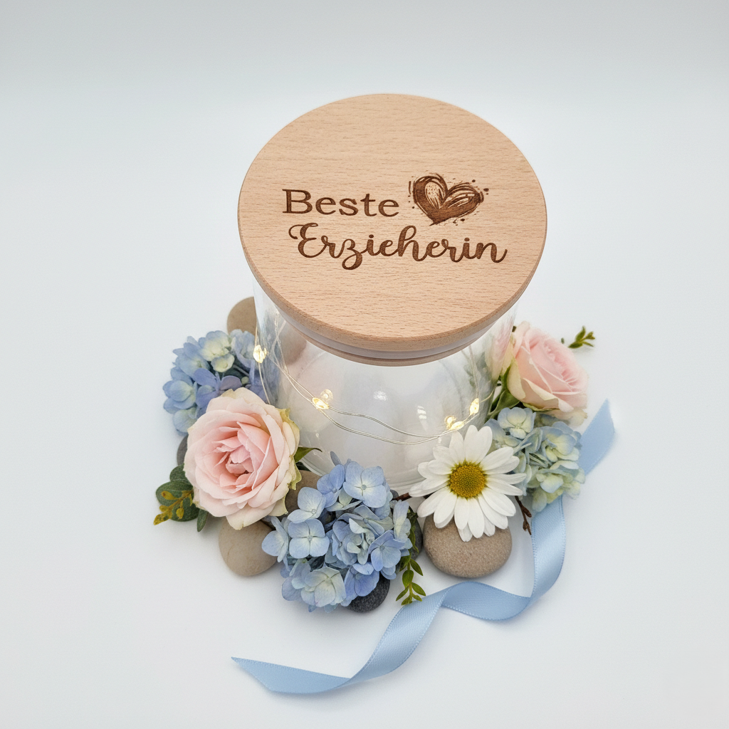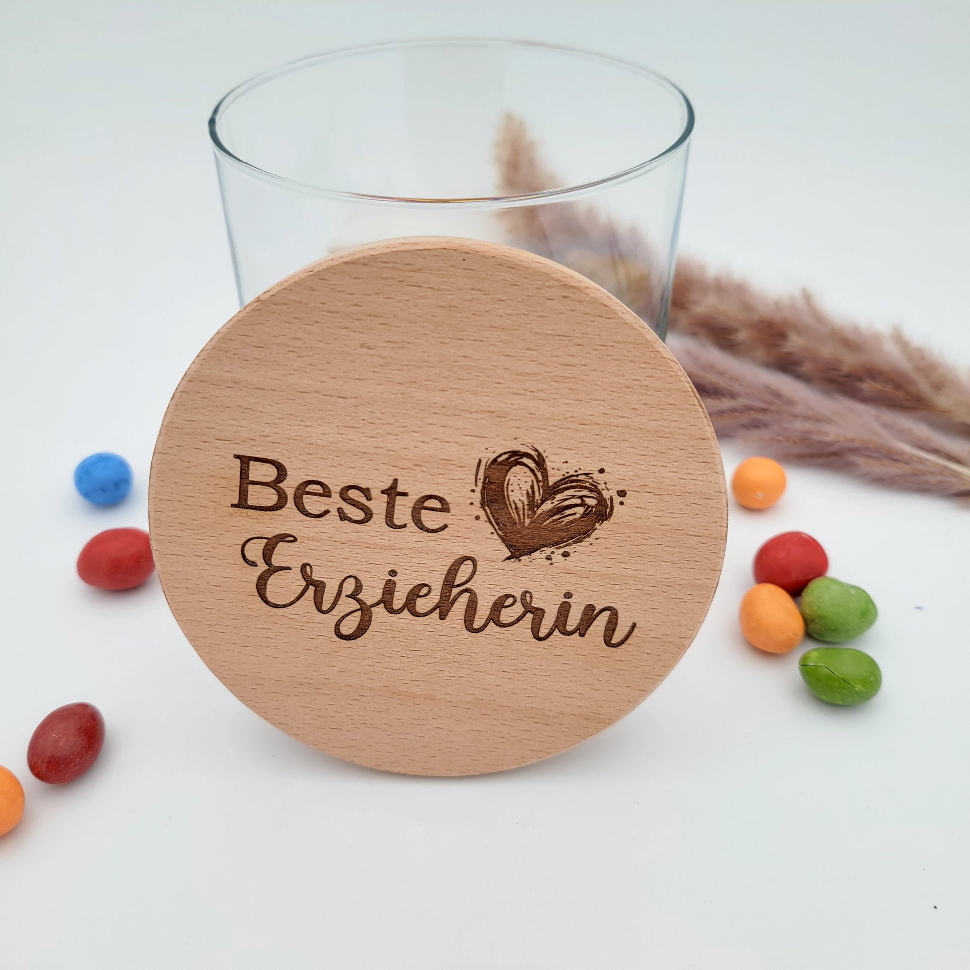 Wunderschönes Abschiedsgeschenk für die Erzieherin, ob im Kindergarten, Kinderkrippe, Hort oder für die Tagesmutter. Als kleines Geschenk und Wertschätzung ihrer Arbeit. Eine Tolle Aufmerksamkeit und Dankeschön zum Abschied. Unser Vorratsglas mit Buche Holzdeckel wird von uns graviert. Gefüllt mit Leckereien oder einem kleinen Gutschein ein schönes Geschenk
