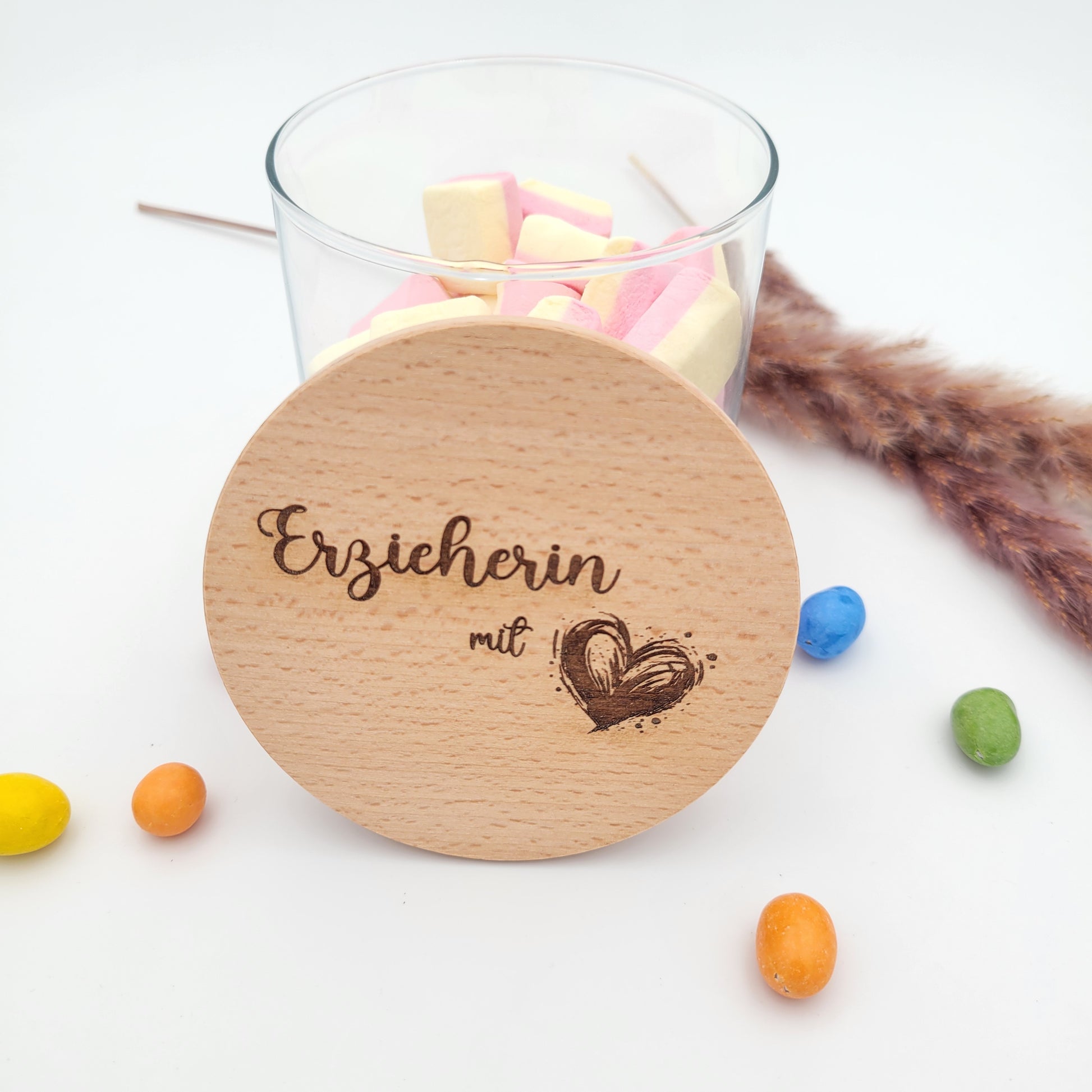 Glas mit Holzdeckel - Erzieherin mit Herz - Tolles Vorratsglas mit Buche Holzdeckel, graviert. Unser Vorratsglas ist eine wunderschöne Geschenkidee für Erzieher, die Kita Leitung als kleines Dankeschön für ihre Arbeit. Gefüllt mit Leckereien oder einem kleinen Gutschein ein schönes Geschenk und eine kleine Aufmerksamkeit. Vielleicht bindest Du noch ein kleines Schleifchen um das Glas, dann ist das Geschenk perfekt.