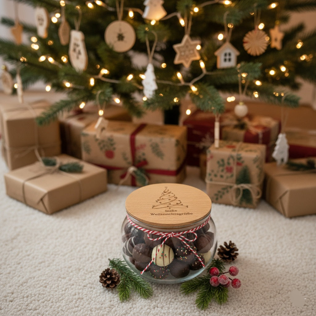 Die besondere Gravur mit einem zarten Tannenbaum und Weihnachtsgruß machen den Bambusdeckel zu etwas besonderem. Ein wunderschönes Weihnachtsgeschenk für dich oder als Geschenk für deine Familie, Freunde, Kollegen oder als Dankeschön für Lehrer, Erzieher, Trainer..