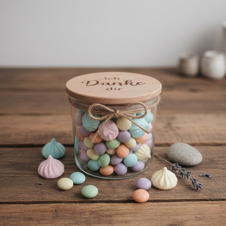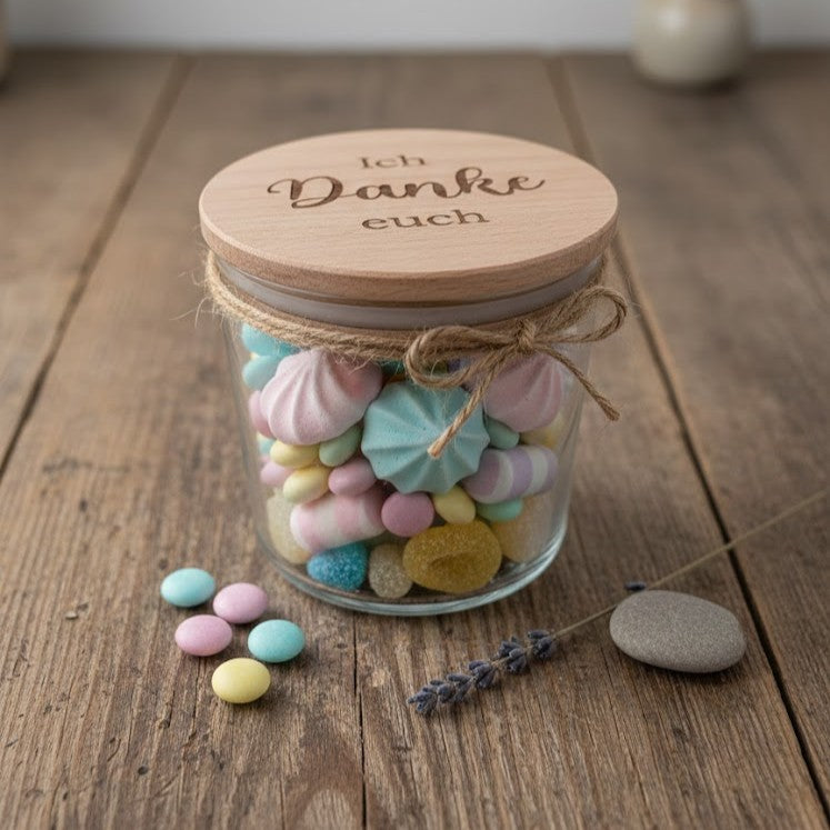 Glas mit Holzdeckel "Ich danke dir / euch", als perfektes Geschenk um DANKE zu sagen.